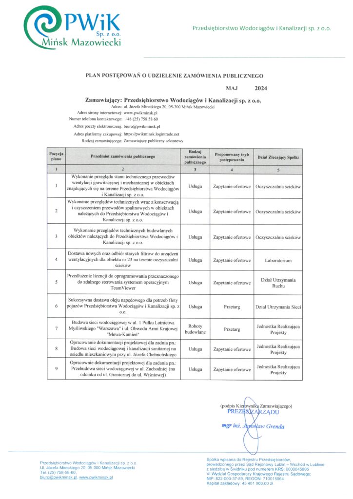 Przedsiębiorstwo Wodociągów i Kanalizacji sp. z o.o. zaprasza do zapoznania się z planem zamówień publicznych na miesiąc maj 2024 r.