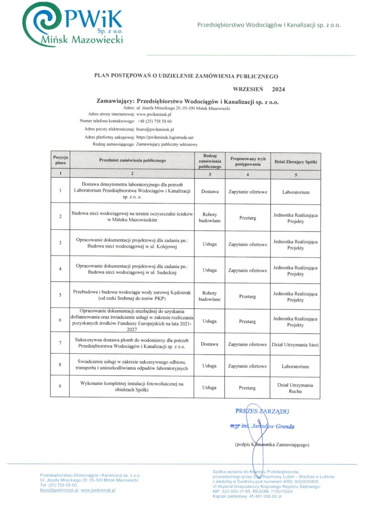 Przedsiębiorstwo Wodociągów i Kanalizacji sp. z o.o. zaprasza do zapoznania się z planem zamówień publicznych na miesiąc wrzesień 2024 r.