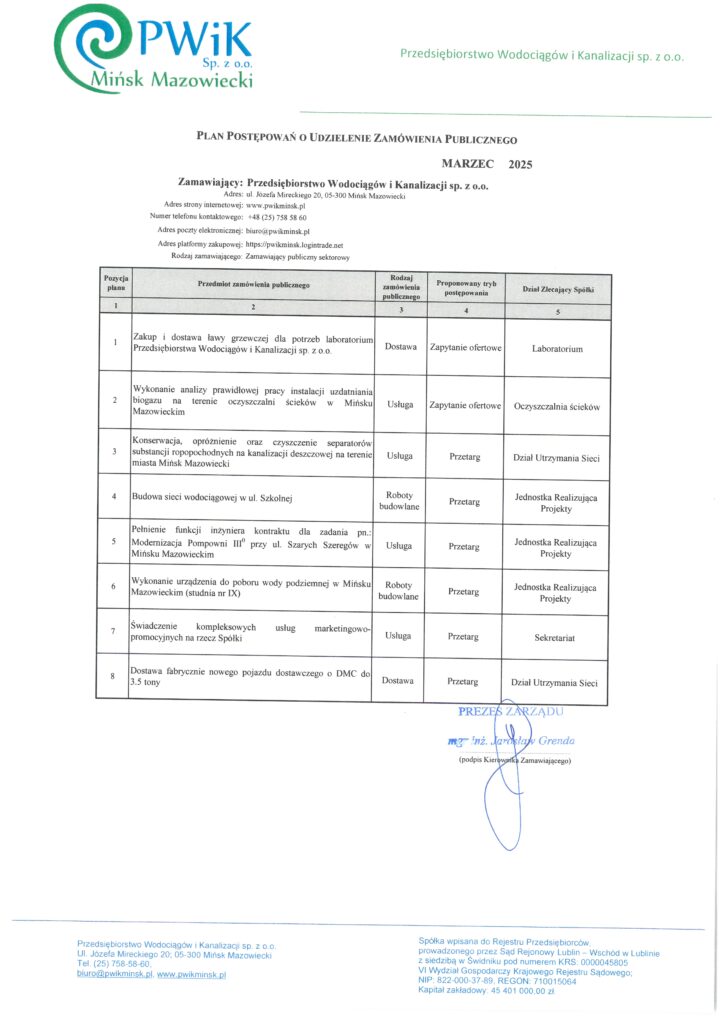 Przedsiębiorstwo Wodociągów i Kanalizacji sp. z o.o. zaprasza do zapoznania się z planem zamówień publicznych na miesiąc marzec 2025 r. Ogłoszenia o wszczęciu zamówienia publicznego wraz ze specyfikacją warunków zamówienia publikowane będą za pośrednictwem platformy zakupowej https://www.pwikminsk.pl/platforma-przetargowa/