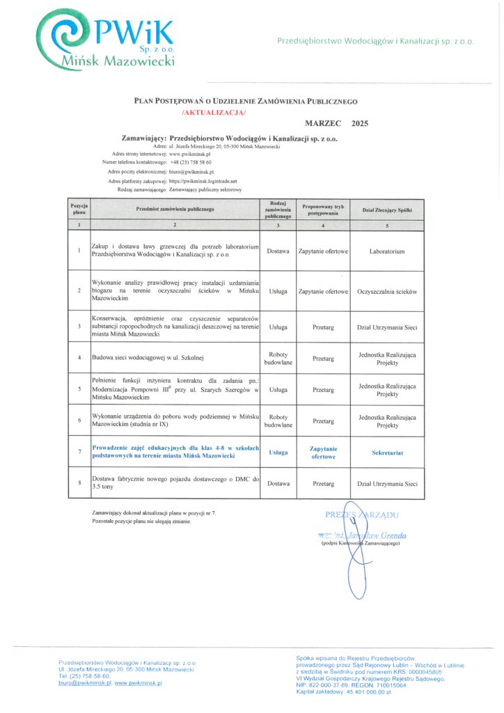 Przedsiębiorstwo Wodociągów i Kanalizacji sp. z o.o. zaprasza do zapoznania się z zaktualizowanym planem zamówień publicznych na miesiąc marzec 2025 r. Ogłoszenia o wszczęciu zamówienia publicznego wraz ze specyfikacją warunków zamówienia publikowane będą za pośrednictwem platformy zakupowej https://www.pwikminsk.pl/platforma-przetargowa/