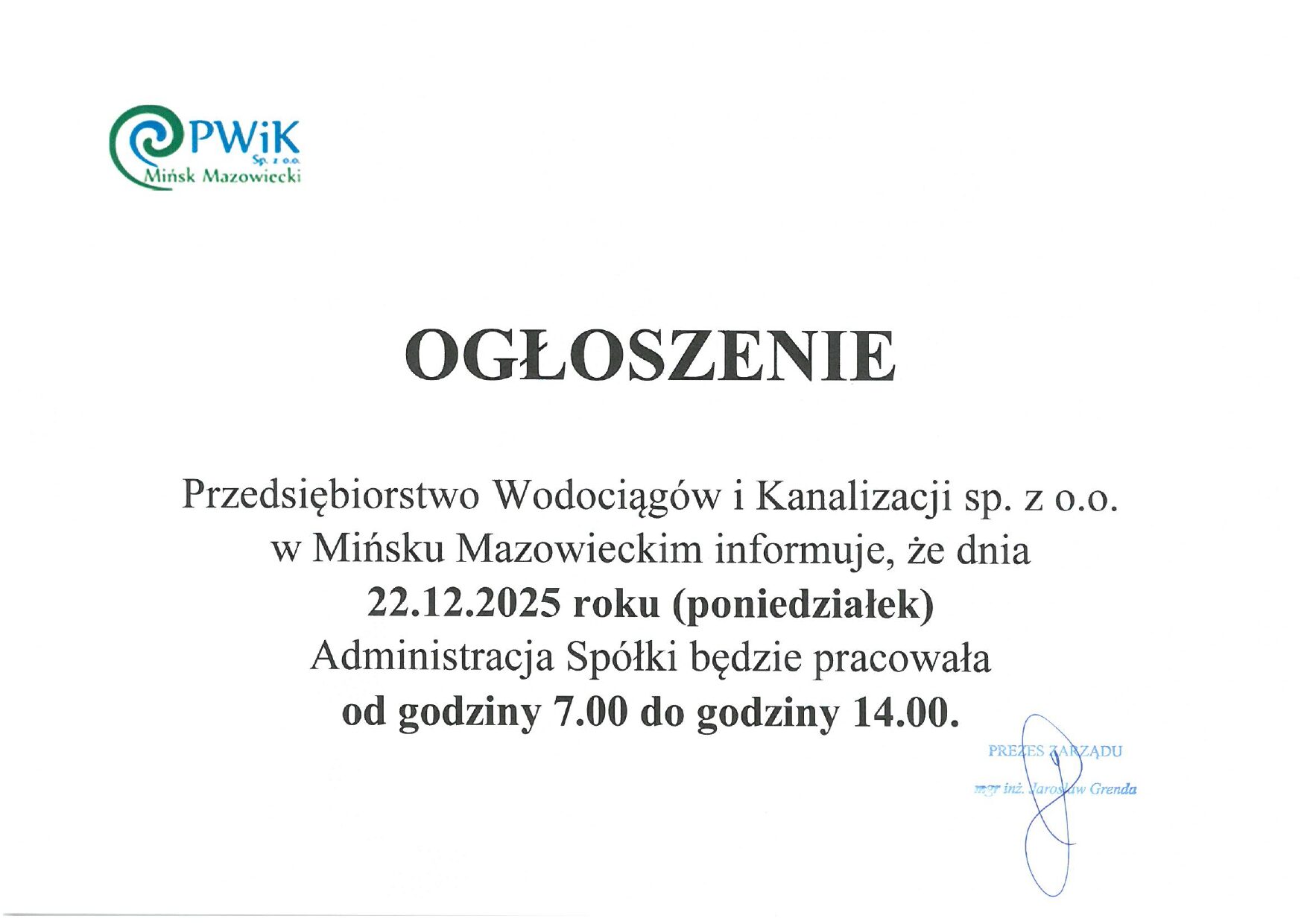 Przedsiębiorstwo Wodociągów i Kanalizacji sp. z o.o. w Mińsku Mazowieckim informuje, że dnia 22.12.2025 roku (poniedziałek) Administracja Spółki będzie pracowała od godziny 7.00 do godziny 14.00.