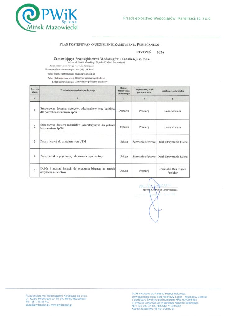 Przedsiębiorstwo Wodociągów i Kanalizacji sp. z o.o. zaprasza do zapoznania się z planem zamówień publicznych na miesiąc styczeń 2026 r. Ogłoszenia o wszczęciu zamówienia publicznego wraz ze specyfikacją warunków zamówienia publikowane będą za pośrednictwem platformy zakupowej https://www.pwikminsk.pl/platforma-przetargowa/