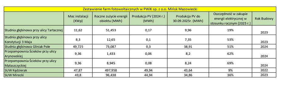 W 2023 roku wychodząc naprzeciw rosnącym cenom energii elektrycznej Spółka wybudowała kolejne farmy fotowoltaiczne. Inwestycja pozwoliła zasilić stację uzdatniania wody SUW Mirecki, a także dwie studnie głębinowe: